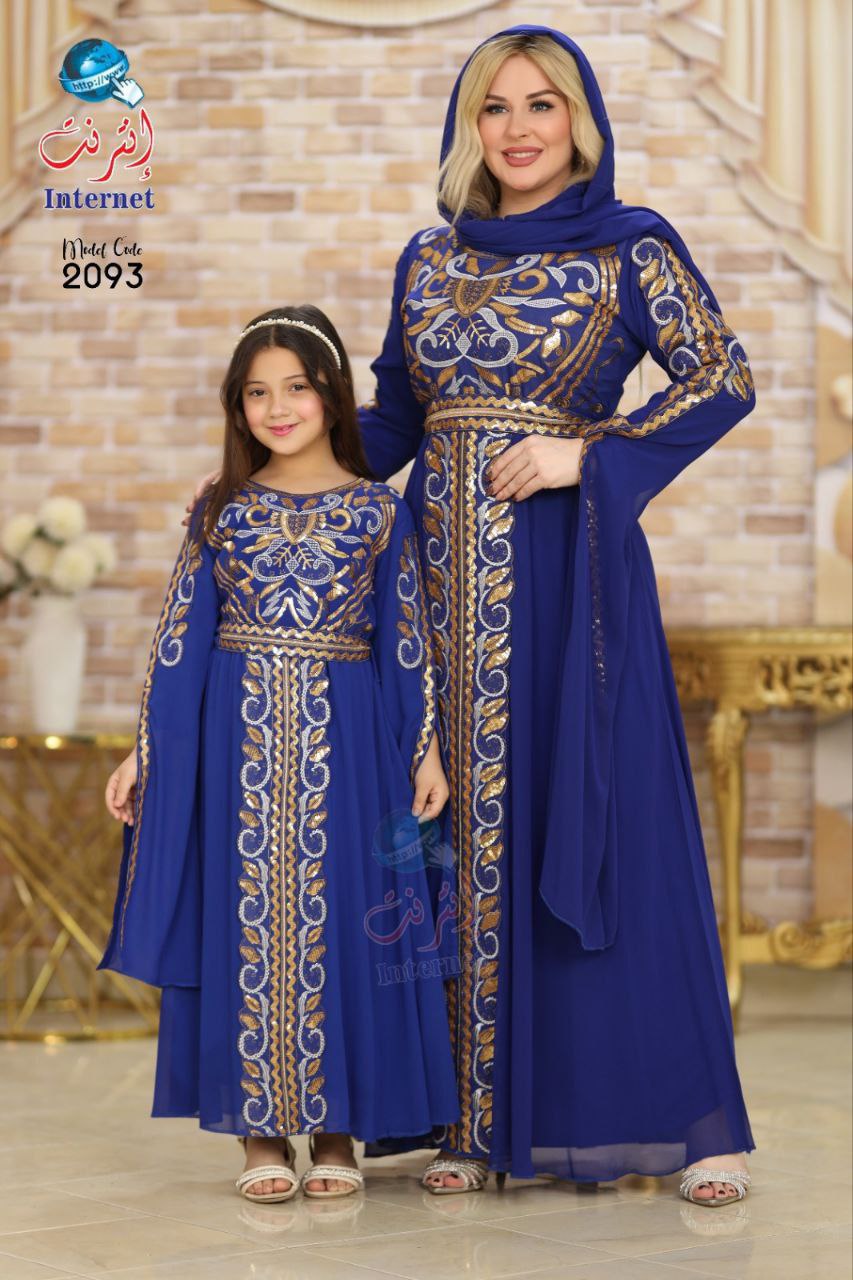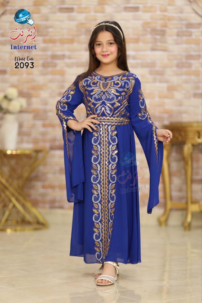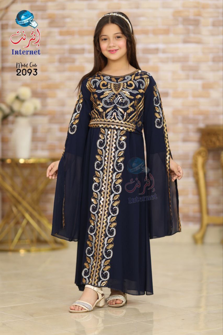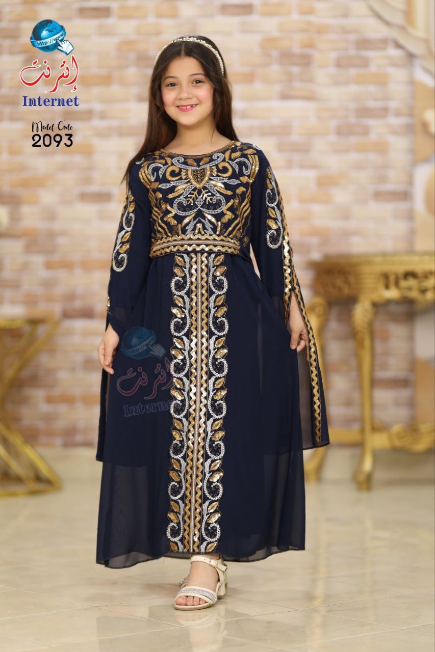 Wannan kyakkyawar rigar yarinya an ƙera ta ne da salon sarauta, tana ɗauke da kyawawan zane-zanen adon zinariya da aka yi da hannu cikin tsari mai burgewa. Launin dark blue ɗinta yana nuna nutsuwa da kima, yayin da ƙirar rigar ke bada cikakken jin daɗi da walwala ga yara.